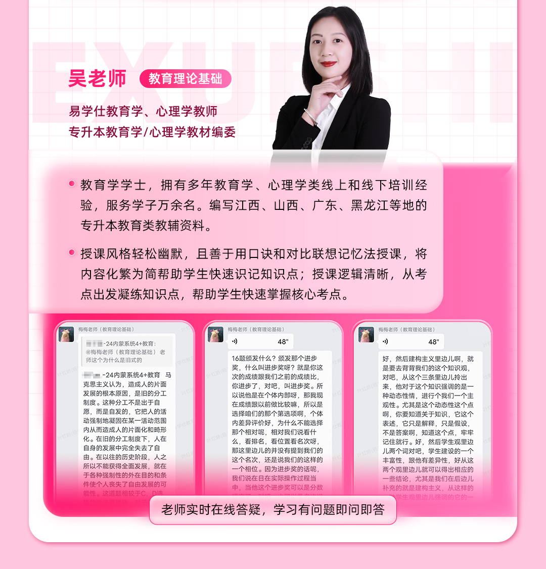 易学仕教育学、心理学教师 专升本教育学/心理学备考资料编委 教育学学士,拥有多年教育学、心理学类线上和线下培训经验,服务学子万余名。编写江西、山西、广东、黑龙江等地的专升本教育类教辅资料。 授课风格轻松幽默,且善于用口诀和对比联想记忆法授课,将内容化繁为简帮助学生快速识记知识点;授课逻辑清晰,从考点出发凝练知识点,帮助学生快速掌握核心考点。