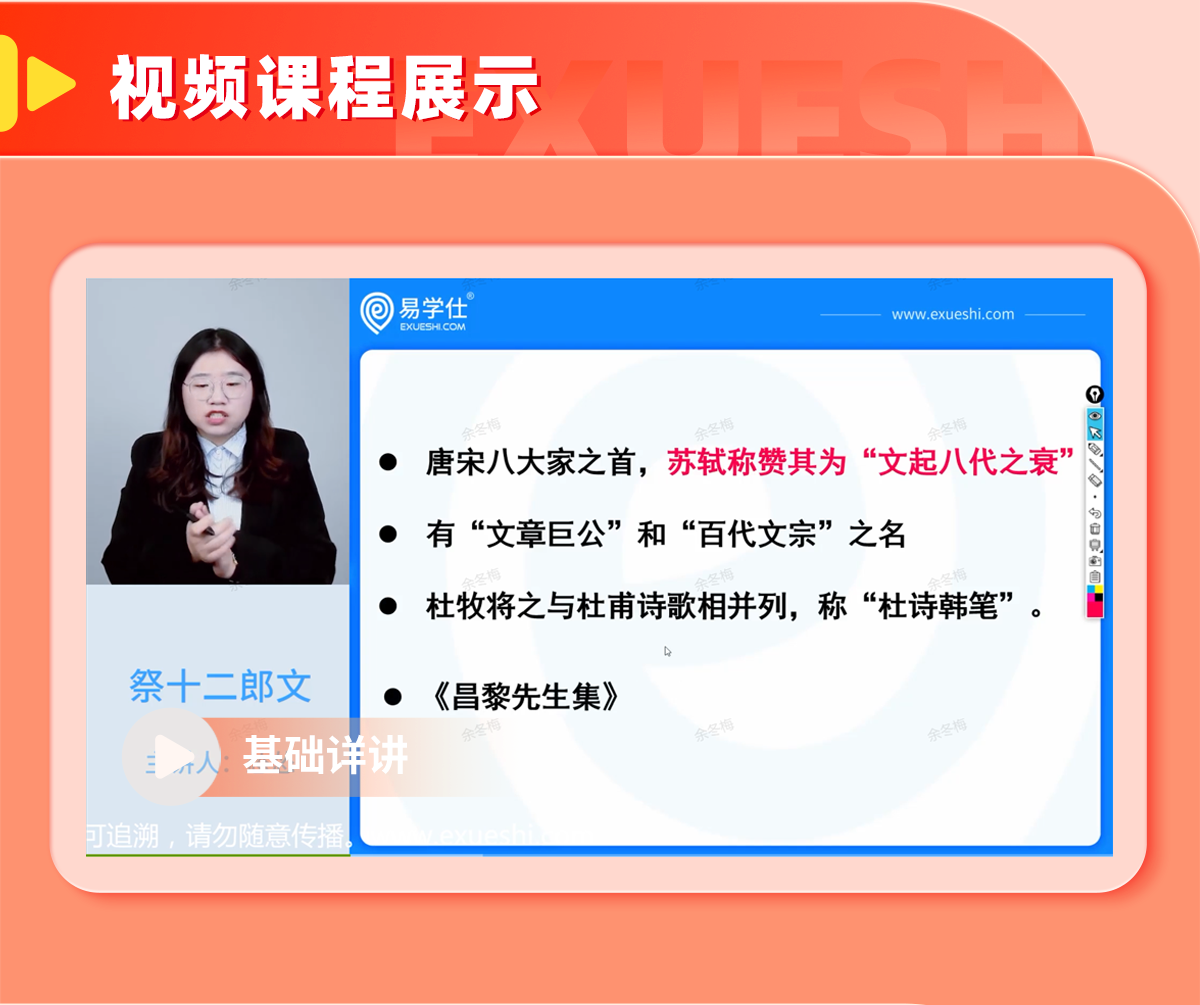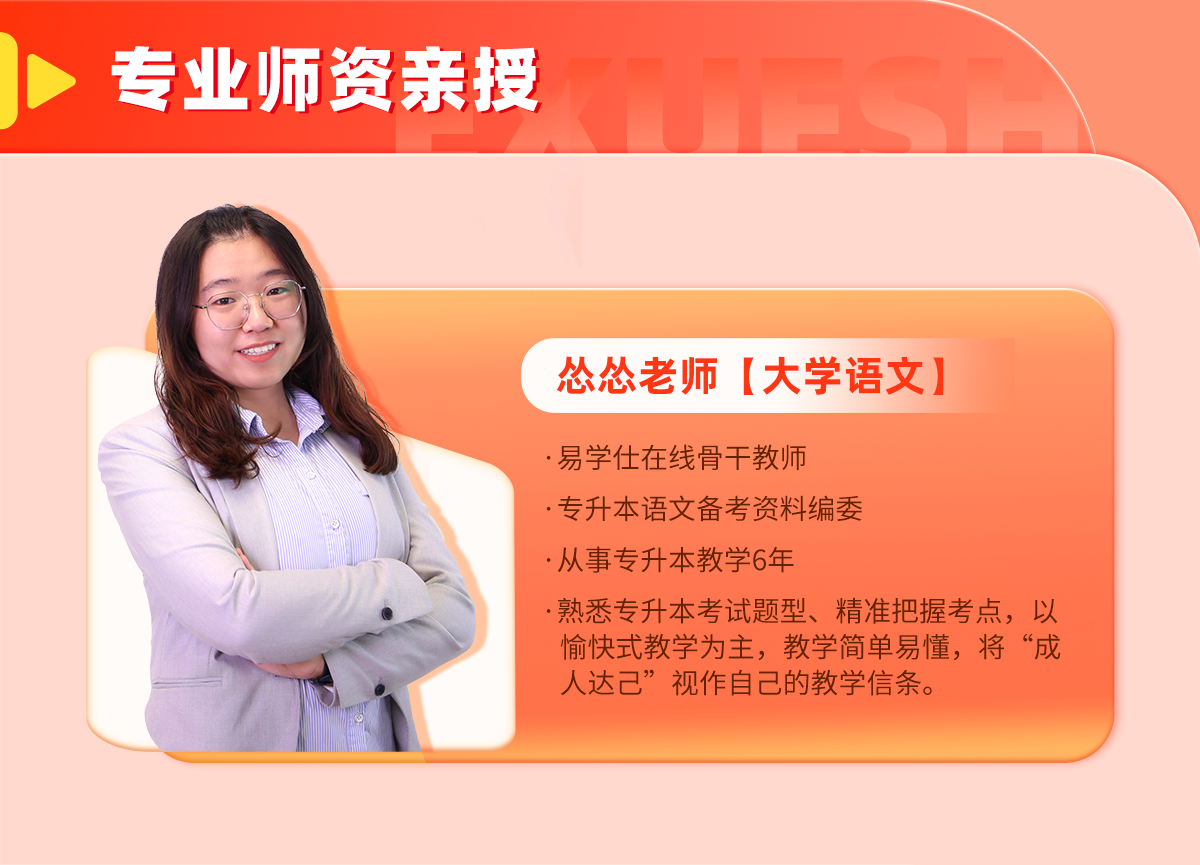 易学仕在线实力教师 专升本语文教材编委 秉承着“授人以鱼,不如授人以渔”的观念,对语文的命题与复习思路有极强的把握,擅长搭建知识树,从一出发,生出万根枝桠,让薄书读厚,厚书读薄,让学生轻松高效夺取高分。 专升本教材教辅资料《专升本大学语文基础教材》、《专升本大学语文冲刺密卷》、《专升本大学语文模考试卷》的编者之一。
