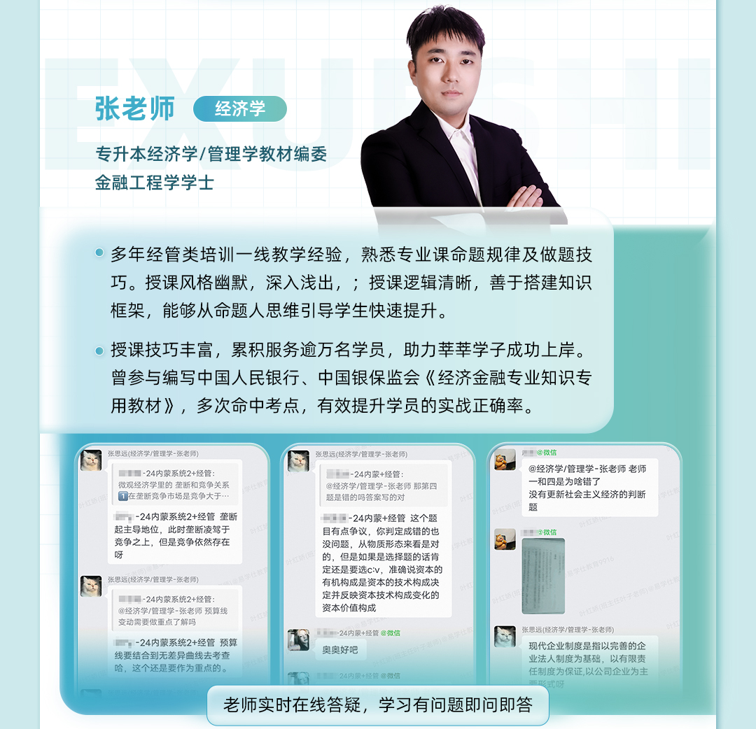 易学仕经济管理教师 专升本经济学/管理学教材编委 金融工程学学士 多年经管类培训一线教学经验,熟悉专业课命题规律及做题技巧。授课风格幽默风趣,深入浅出,深受学生喜爱;授课逻辑清晰,善于搭建知识框架,能够从命题人思维引导学生快速提升。 线上+线下授课技巧丰富,累积服务逾万名学员,助力莘莘学子成功上岸。 曾参与编写中国人民银行、中国银保监会《经济金融专业知识专用教材》,多次命中考点,有效提升学员的实战正确率。 编订专升本教辅资料《专升本管理学教材》、《专升本经济学教材》等等。