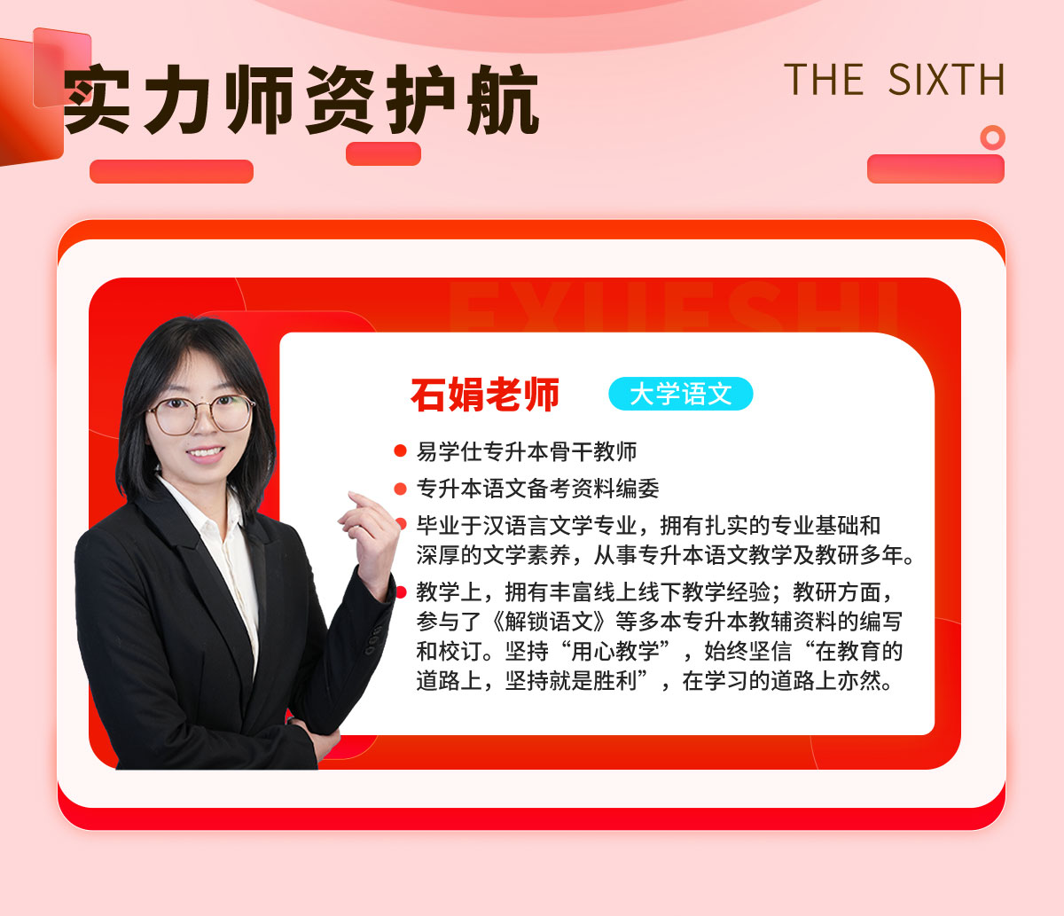 易学士在线语文骨干教师 毕业于汉语言文学专业,拥有扎实的专业基础和深厚的文学素养,从事专升本语文教学及教研多年。 教学上,拥有丰富线上线下教学经验;教研方面,参与了《解锁语文》等多本专升本教辅资料的编写和校订。坚持“用心教学”,始终坚信“在教育的道路上,坚持就是胜利”,在学习的道路上亦然。