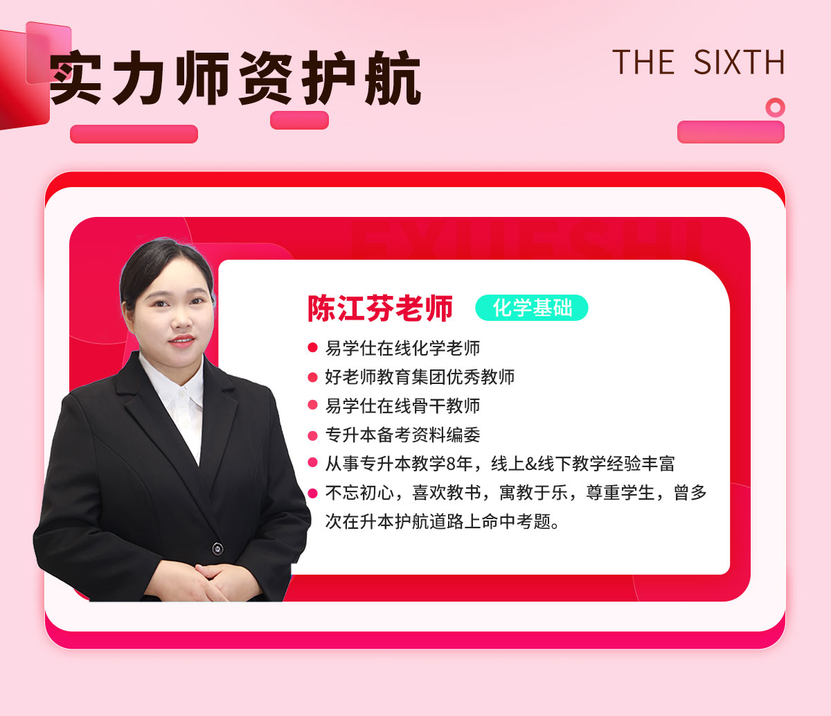 易学仕资深化学教师 专升本化学相关备考教材编委 曾在高职院校任教,从教期间主要讲授课程有机化学、生物化学、基础化学等专业基础课程。 授课通俗易懂,熟悉专升本考试题型、精准把握考点。教学风格幽默、思维逻辑清晰,从知识组织架构着手,由简入繁,以实际问题引导学生思考,激发学生思维,提高学生学习兴趣,帮助学生快速掌握核心知识点。