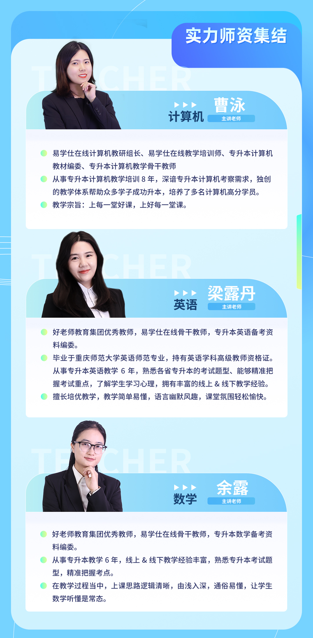好老师教育集团数学名师 易学仕在线数学骨干教师 易学仕在线教学培训师 专升本高等数学教材编委 从事教育培训7年,自创一套独特的教学方法,提分大招,帮助数万名学生顺利升本。培养了很多优秀的学员升入重庆医科大学、云南农业大学、西华大学、贵州大学、陕西理工大学、山东临沂大学等优质本科院校。参与编订《专升本高等数学基础教材》、《专升本高等数学冲刺密卷》、《专升本高等数学模考试卷》、《专升本高等数学初级入门》等专升本教材和教辅资料。