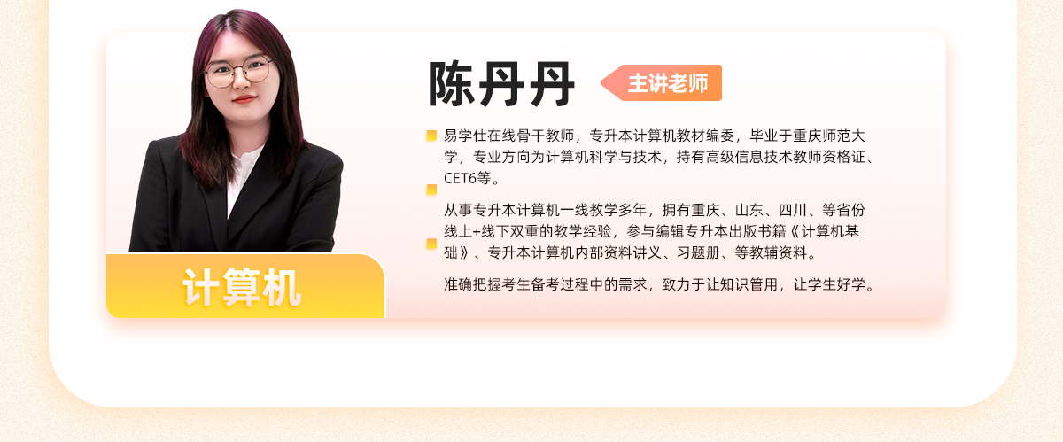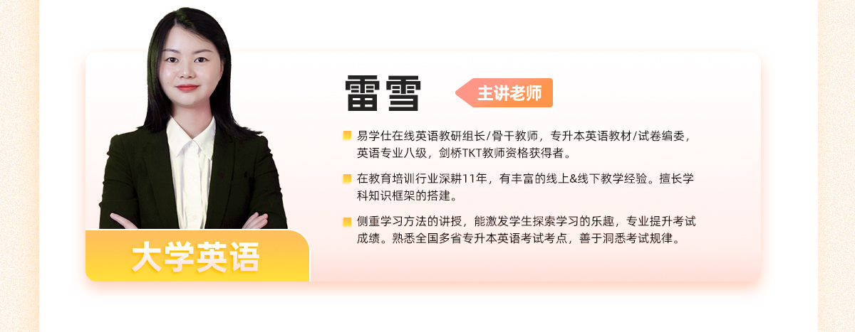 易学仕在线英语教研组长 易学仕在线教学培训师 专升本大学英语教材编委 从事教育培训11年,曾在新东方教学,英语专业八级、剑桥TKT教师资格获得者。擅长多维度立体化教学,独创“万能高分法”,专业挑刺,专业提分。每年都能培养很多优秀的高分学员,历届学员中有在四川外国语大学、云南师范大学、贵州大学、陕西理工大学、山东临沂大学等本科院校就读的。参与编订《专升本大学英语基础教材》、《专升本大学英语冲刺密卷》、《专升本大学英语模考试卷》、《专升本英语初级入门》等专升本教材和教辅资料。