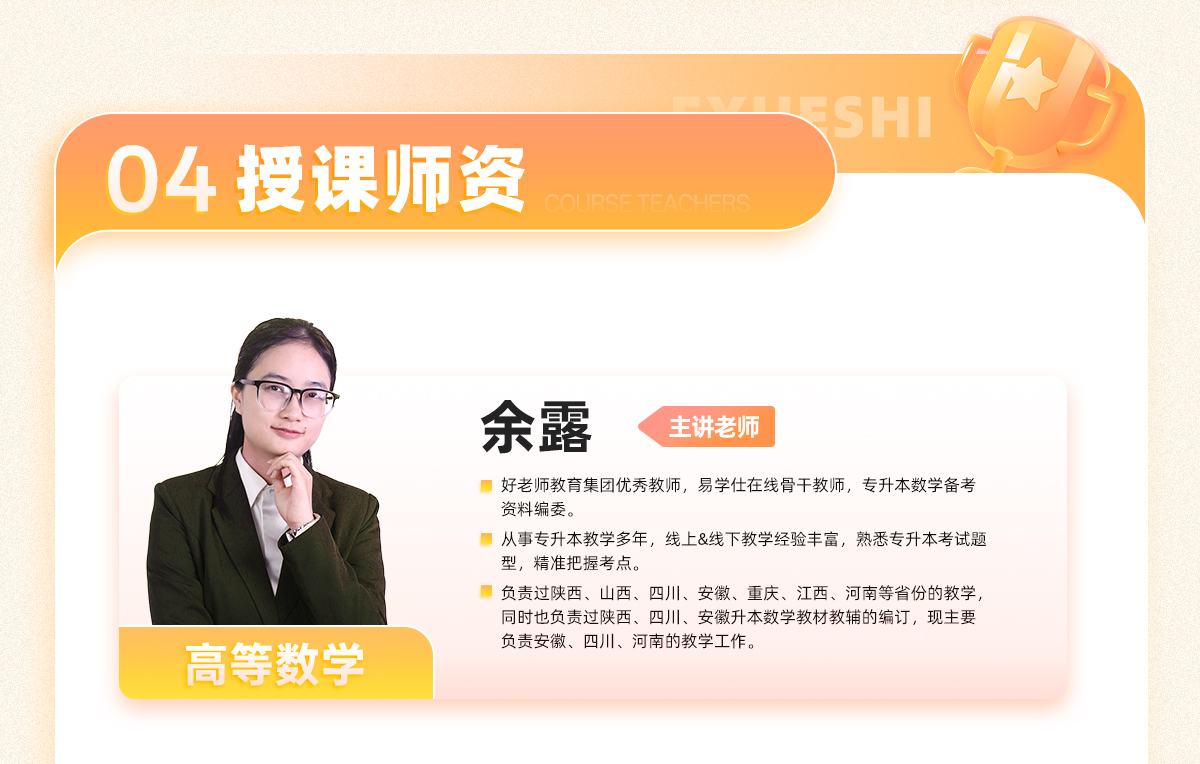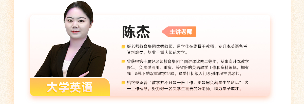 好老师教育集团优秀教师 易学仕在线英语名师 获得英语高级教师资格证、CET6、TEM4、普通话二级甲等。 毕业于重庆师范大学,学习过专业的教学体系以及教学方法。 从教专升本5年,熟悉专升本历年考点,熟练把控课堂。 以专业的教学课堂和严谨的教学态度赢得学生喜爱。力图用活跃的课堂氛围感染学生,用积极的教学热情点亮学生,助力无数学子成才。