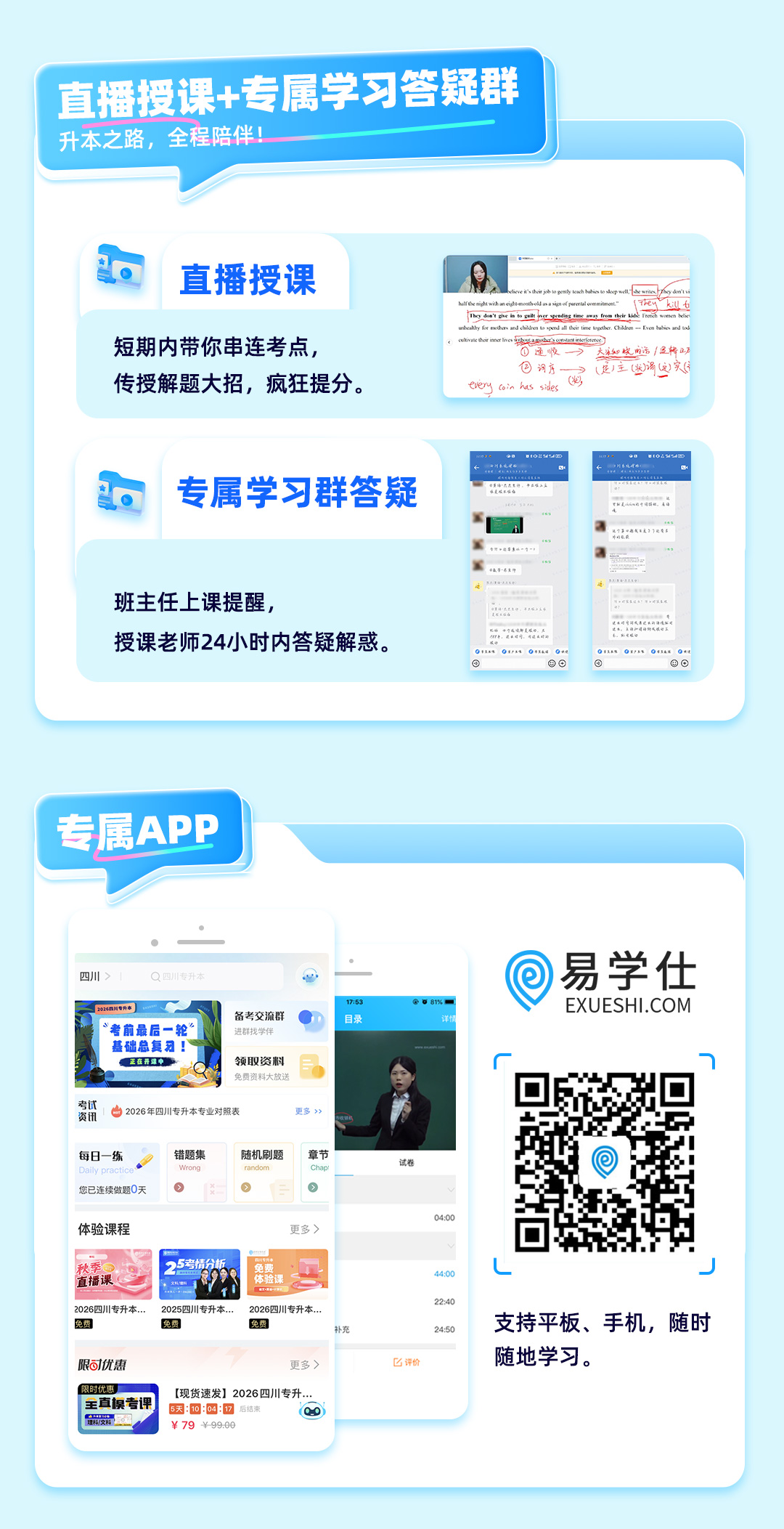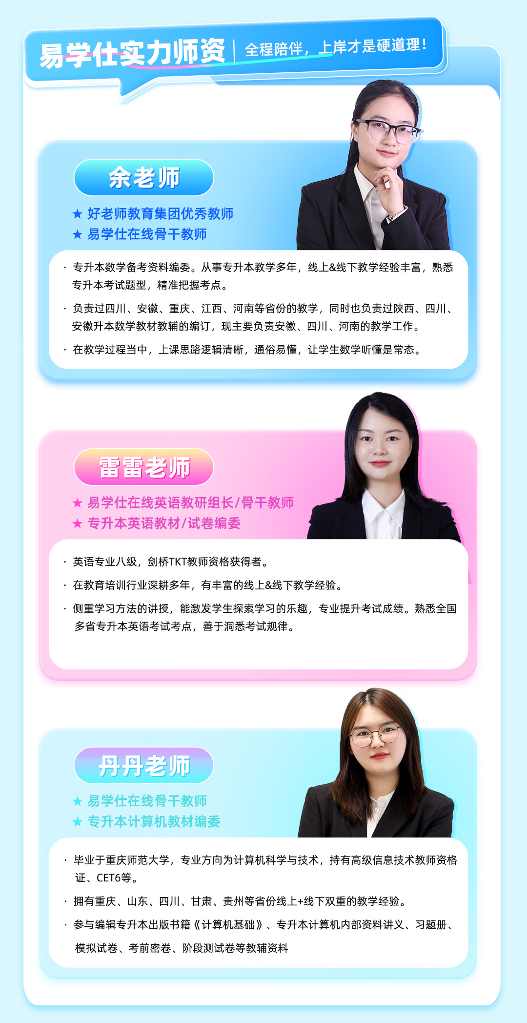 易学仕在线英语教研组长 易学仕在线教学培训师 专升本大学英语教材编委 从事教育培训11年,曾在新东方教学,英语专业八级、剑桥TKT教师资格获得者。擅长多维度立体化教学,独创“万能高分法”,专业挑刺,专业提分。每年都能培养很多优秀的高分学员,历届学员中有在四川外国语大学、云南师范大学、贵州大学、陕西理工大学、山东临沂大学等本科院校就读的。参与编订《专升本大学英语基础教材》、《专升本大学英语冲刺密卷》、《专升本大学英语模考试卷》、《专升本英语初级入门》等专升本教材和教辅资料。